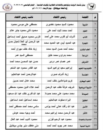جامعة سوهاج تعلن نتيجة انتخابات رؤساء الإتحاد ونوابهم ب ١٧ كلية