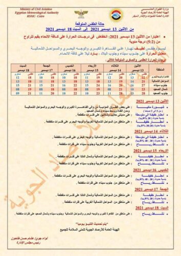وتوقع خبراء الأرصاد، أن يكون هناك فرصة لتكون الشبورة المائية صباحا على الطرق المؤدية من وإلى القاهرة الكبرى.