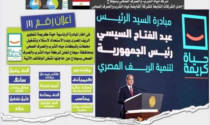 فى اطار المبادرة الرئاسية لتطوير الريف المصرى حياة كريمة وبدء الاستعداد لاستلام وتشغيل محطات وشبكات مياه الشرب والصرف الصحى بسوهاج اعلن المهندس محمد صلاح الدين عبد الغفار رئيس مجلس ادارة شركة مياه الشرب والصرف الصحى بسوهاج والعضو المنتدب عن اتاحة فرص عمل للخريجين فى 14 تخصص تشمل وظائف مهندس وكيميائى واخصائى سلامة وصحة مهنية ومحاسب واخصائى موارد بشرية وكاتب ومدخل بيانات وامين خزينة وفنى مساحة وفنى تشغيل وصيانة وفنى معمل وسائق وسائق معدات ثقيلة وعامل تشغيل وحرفى.