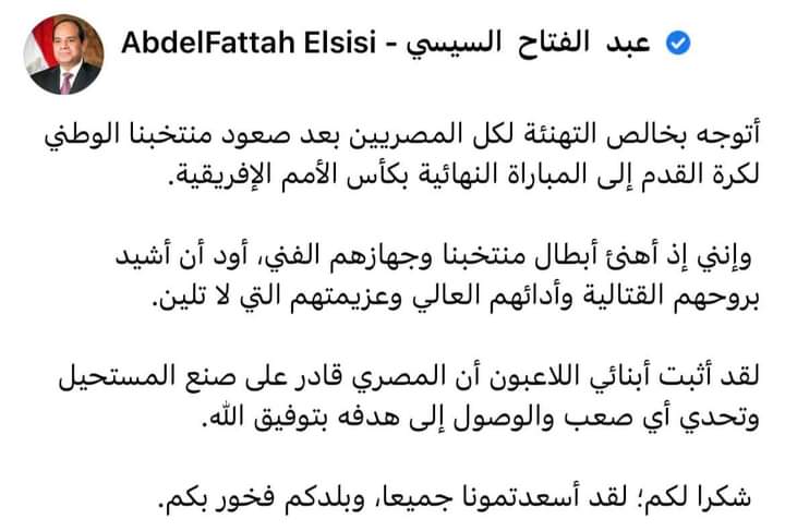 وكتب عبر صفحته على مواقع التواصل الإجتماعي : أتوجه بخالص التهنئة لكل المصريين بعد صعود منتخبنا الوطني لكرة القدم إلى المباراة النهائية بكأس الأمم الإفريقية.