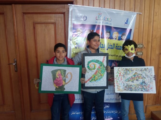 كما تعرف طلاب جامعة الطفل على الطباعه بالاستنسل وفن الكولاج وأشغال ورقيه وزيارة مصنع الهاند تافت ” السجاد لآلي” والمعرض الفني المجمع لقسم التربيه الفنيه وزيارة أتيليه الخزف ومصنع الأنوال اليدويه.