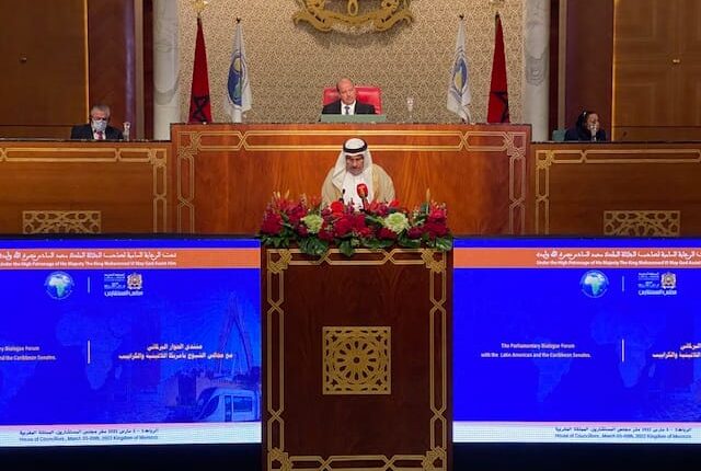 جاء ذلك خلال كلمته اليوم في افتتاح أعمال منتدى الحوار البرلماني مع مجالس الشيوخ في منطقة أمريكا اللاتينية والكاريبي الذي تنظمه رابطة مجالس الشيوخ والشورى والمجالس المماثلة في أفريقيا والعالم العربي والمقام في المملكة المغربية، داعياً إلى تعزيز آليات التعاون البرلماني العربي الإفريقي اللاتيني على كافة المستويات لمواجهة التحديات المشتركة التي تهدد