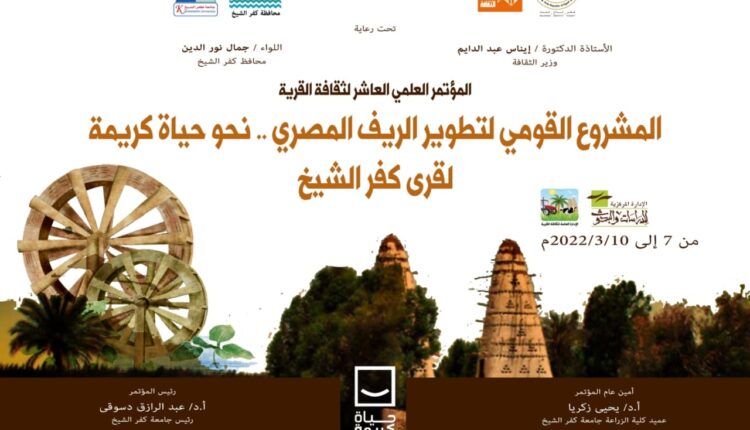 تحت رعاية وزير الثقافة الدكتور إيناس عبدالدايم ومحافظ كفر الشيخ اللواء جمال نورالدين والدكتور عبد الرازق دسوقي رئيس جامعة كفر الشيخ، رئيس المؤتمر، ينظم المركز الثقافي بمحافظة كفر الشيخ المؤتمر العلمي العاشر لثقافة القرية.