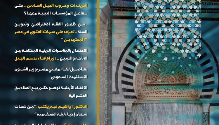 أمَّا في باب “رؤى إفتائية” فيتناول العدد موضوعًا حول “سمات الفتوى في عصر الأئمة المجتهدين”، وكيف اتَّفق المتصدِّرون للفتوى على مصادر رئيسية للتشريع؟ وكذلك ظهور الفقه الافتراضيِّ وتفاصيل تدوين السُّنَّة وتصنيف الفتاوى.