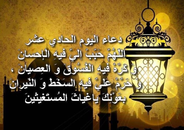 للهم كما بلغتنا اليوم الحادي عشر من شهرگ الفضيل بلغنا إكمال عدته وإدراگ ليلة القدر واكتبنا فيه من عتقائگ من النار يارب العالمين ” اللهم إني أسألگ الرضا بالقضاء، وبرد العيش بعد الموت، ولذة النظر إلى وجهگ، والشوق إلى لقائگ في غير ضراء مضرة ولا فتنة مضلة… أمين