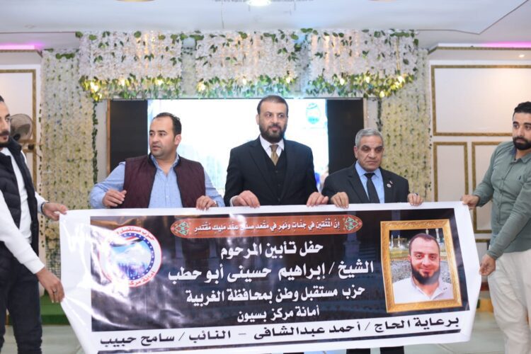 ثم تكريم أسرة الفقيد من قبل النائب محمد عريبي أمين حزب مستقبل وطن بالغربية وعضو مجلس الشيوخ والنائب سامح حبيب عضو مجلس النواب والمهندس احمد عبدالشافى امين عام الحزب بمركز بسيون والمهندسة منى صالح رئيس مركز ومدينة بسيون وبحضور لفيف من القيادات السياسية والتنفيذية والشعبية بالمحافظة