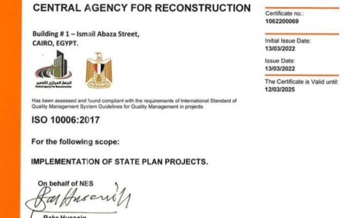وأشار اللواء محمود نصار، رئيس الجهاز المركزي للتعمير، إلى أن الجهاز اتجه نحو التأهيل للحصول على شهادة الأيزو في تطبيق المواصفات القياسية الدولية (نظام إدارة الجودة “ISO9001:2015″، وتطبيق إرشادات المواصفة الدولية لإدارة الجودة في المشروعات “ISO10006:2017″، وتم تشكيل إدراة جودة تضم عناصر من جميع قطاعات وإدارات الجهاز لتطبيق خطوات تأهيل الجهاز، وتمت الاستعانة بالمعهد القومي للجودة التابع لوزارة التجارة والصناعة، وهو بيت الخبرة الوطني المختص بنشر ثقافة ومفاهيم الجودة في المجتمع المصري.