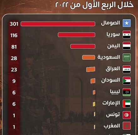 وأشار التقرير إلى تصدر الصومال مؤشر الإرهاب في المنطقة العربية خلال الثلاثة شهور الأولي من 2022، حيث نُفذ على أراضيها 68 عملية إرهابية، فيما جاءت العراق كثاني دولة في المؤشر وتبعها سوريا. وظلت الجماعات الإرهابية مثل حركة الشباب في الصومال وداعش في سوريا والعراق قادرين على الحركة وحرية التنقل والمناورة وهو ما سمح لهم بالتخطيط والتنفيذ وزرع العبوات الناسفة والأجهزة المتفجرة ونصب الكمائن وتجنيد أفراد أخرين.