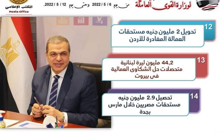 وامتد الحصاد ليشمل نجاح مكتب التمثيل العمالي التابع للوزارة بالسفارة المصرية ببيروت- لبنان، في الحصول علي 44 مليون و226 ألفاً و121 ليرة لبنانية مستحقات مالية من حل الشكاوى للعمالة المصرية التي تقدمت بها للمكتب.