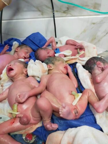 أنجبت سيدة بمدينة طنطا 5 توائم في ولادة قيصرية بمستشفي المنشاوي العام اليوم السبت ، مكتملي النمو وبحالة صحية جيدة، وكذلك الأم، وسط حالة من الفرحة والسعادة انتابت جميع العاملين بالمستشفى وأسرة الأطفال.