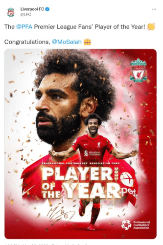 وأعلن نادي ليفربول الإنجليزي عن فوز نجمه وهدافه محمد صلاح، بجائزة أفضل لاعب في الموسم بالدوري الإنجليزي الممتاز من رابطة لاعبي كرة القدم المحترفين وفقا لتصويت الجمهور.