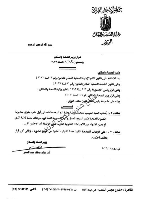 أصدر الدكتور خالد عبدالغفار، وزير الصحة والسكان، القرار رقم 462 لسنة 2023، بندب الدكتور محمد محمد عطية أبو السعد، أخصائي أول طب بشري بمديرية الشؤون الصحية بمحافظة كفر الشيخ، للعمل وكيلاً للمديرية المذكورة، وذلك لمدة 3 أشهر، أو لحين الانتهاء من الإجراءات القانونية اللازمة لشغل الوظيفة أيهما أقرب.