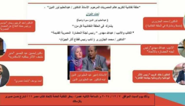 يدير الكاتب والأديب عبد الله مهدي رئيس لجنة الحضارة المصرية القديمة باتحاد كتاب مصر الحلقة النقاشية التي تنظمها اللجنة بعنوان «عبدالحليم نور الدين سيرة وتحية» ، حديثا من القلب والوجدان ولمسة وفاء تكريما لعالم المصريات الكبير الراحل الدكتور عبدالحليم نور الدين العالم الٱثارى والإنسان.