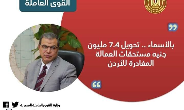 أعلن وزير القوى العاملة، محمد سعفان، أن مكتب التمثيل العمالي التابع للوزارة بالسفارة المصرية بعمان-الأردن، استطاع بالمتابعة اللحظية والجهود المبذولة والمقابلات مع المسئولين بمؤسسة الضمان الاجتماعي بالأردن، واستكمالا لما تم تحويله سابقا، تم تحويل القائمة (30) من مستحقات الضمان الاجتماعي لنحو 241 عامل مصري لدى المؤسسة غادروا عمان نهائيا.