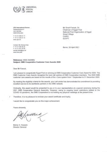 وفي نفس السياق تسلم الدكتور شريف فاروق رئيس مجلس ادارة البريد المصري خطاب تهنئة من السفير بشار حسين مدير عام المكتب الدولي لاتحاد البريدي العالمي يهنئ فيه البريد المصري علي حصوله علي جائزة “تعاونيات البريد السريع” وحصولة علي شهادة التميز بعد تحقيقه طفرة كبيرة في خدمة عملاء البريد السريع على المستوى الدولي قائلاً : ” لقد أظهر مركز خدمة عملاء البريد المصري الخاص بخدمة البريد السريع الدولي التزاماً عالي المستوى علي المستويين الاقليمي والدولي وذلك بتقديم خدمة ممتازة و متميزة لكافة شركائة الدوليين الاعضاء في شبكة البريد السريع الدولية و ذلك بإستيفائه كافة معايير الجدارة التي تأهل بموجبها للحصول على الجائزة ”