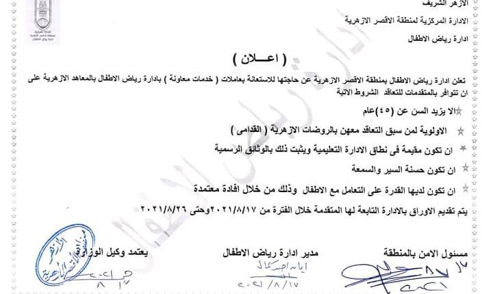 اعلنت إدارة رياض الأطفال بمنطقة الأقصر الأزهرية عن حاجتها للإستعانة بعاملات خدمات معاونة برياض الأطفال بالمعاهد الأزهرية.