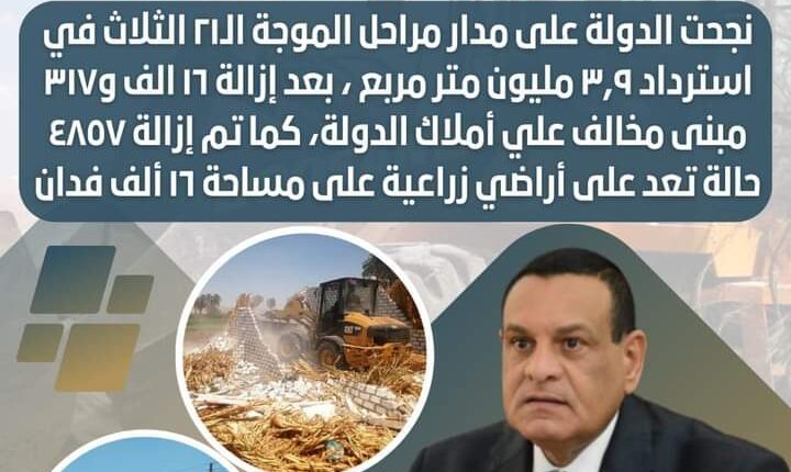 وكشف اللواء هشام آمنة عن جهود الأجهزة التنفيذية بالمحافظات وجهات الدولة المختلفة التي نجحت على مدار مراحل الموجة الـ٢١ الثلاث في استرداد ٣,٩ مليون متر مربع من جميع المحافظات، بعد إزالة ١٦ ألف و٣١٧ مبنى مخالف علي أملاك الدولة، كما تمكنت أيضاً من إزالة ٤٨٥٧ حالة تعد على أراضي زراعية على مساحة ١٦ ألف فدان، كما تم إزالة ٣٤٩ مخالفة استزراع سمكي بمساحة ٢٧٧٩ فدانا بمحافظة بورسعيد .