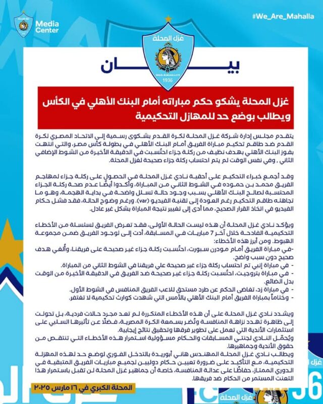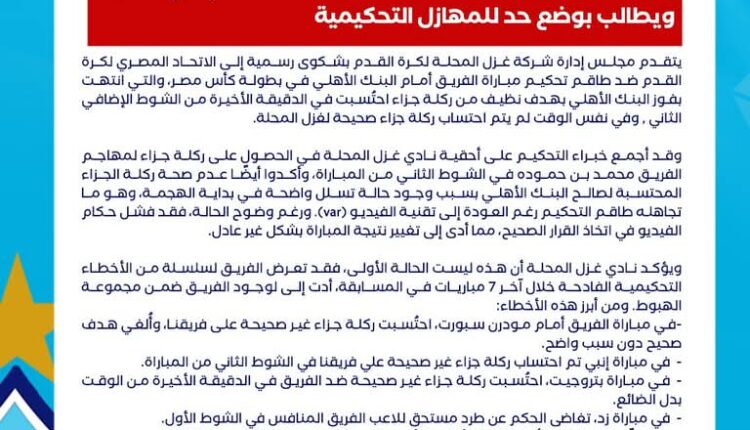 تقدم مجلس إدارة شركة غزل المحلة لكرة القدم بشكوى رسمية إلى الاتحاد المصري لكرة القدم ضد طاقم تحكيم مباراة الفريق أمام البنك الأهلي في بطولة كأس مصر، والتي انتهت بفوز البنك الأهلي بهدف نظيف من ركلة جزاء احتُسبت في الدقيقة الأخيرة من الشوط الإضافي الثاني , وفي نفس الوقت لم يتم احتساب ركلة جزاء صحيحة لغزل المحلة.
