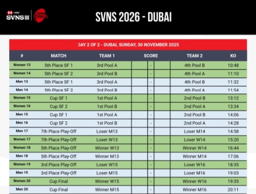 وتُختتم مواجهات دور المجموعات للسيدات بقمة مرتقبة تجمع بين أستراليا وبريطانيا العظمى عند الساعة 6:11 مساءً. أما يوم الأحد الموافق 30 نوفمبر، فيتم تخصيص يوم كامل لمنافسات الأدوار الإقصائية، حيث تُقام وللمرة الأولى جميع مباريات سلسلة “اتش اس بي سي العالمية لسباعيات الرجبي على ملعب “Pitch 1” على مدار اليومين، في حين تُقام منافسات الفرق المدعوّة على الملاعب من 2 إلى 9.