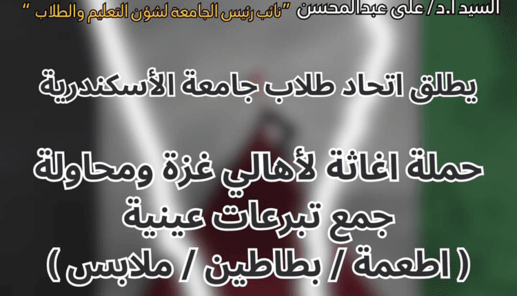 تضامناً مع الشعب الفلسطيني فى دفاعه عن حقوقه المشروعة ورفعاً للمعاناة عنهم، وتحت رعاية الدكتور عبد العزيز قنصوه رئيس جامعة الإسكندرية، والدكتور علي عبد المحسن القائم بأعمال نائب رئيس الجامعة لشئون التعليم والطلاب، ينظم إتحاد طلاب جامعة الاسكندرية حملة إغاثة وجمع تبرعات عينية “أطعمة- بطاطين- ملابس” لأهالي قطاع غزة، وذلك بجميع مقرات إتحاد الطلاب بكليات جامعة الاسكندرية، حيث يتم فرز وتعبئة هذه التبرعات وتجهيزها تمهيداً لإرسالها لنجدة الشعب الفلسطـيني الأعزل عبر القنوات الرسمية للدولة المصرية، كنوع بسيط لمؤازرتهم في محنتهم، ولن يتم قبول أي تبرعات مادية.